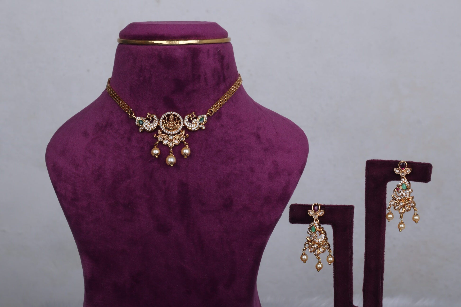 💎 Embrace the elegance of tradition with the Royal Lakshmi Peacock Choker Set – a timeless treasure that defines grace and luxury. Shop now! 💎